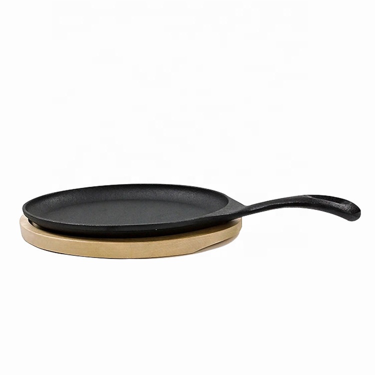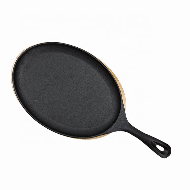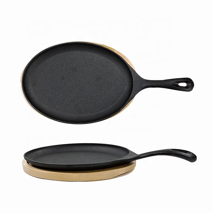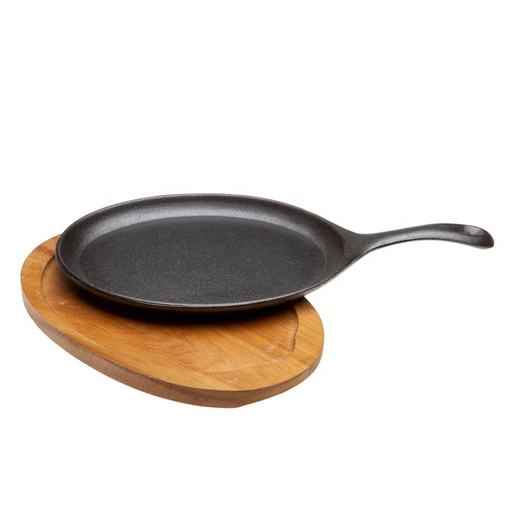 સિઝલિંગ સ્ટીક હોટ પ્લેટ કાસ્ટ આયર્ન ગ્રીલ ફ્રાઈડ પાન BBQ ગ્રિડલ ઓવલ સ્ટીક સિઝલિંગ પ્લેટ લાકડાના આધાર સાથે: