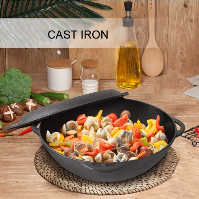 Egy öntöttvas wok egy műanyag zacskóba, majd tegye az öntöttvas wok-ot egy színes vagy barna belső dobozba, Több belső doboz egy mesterkartonba.