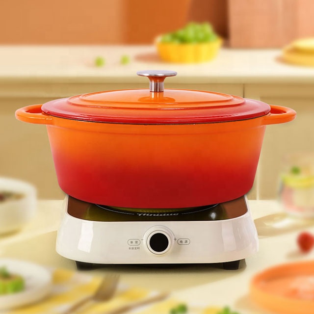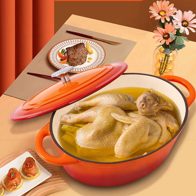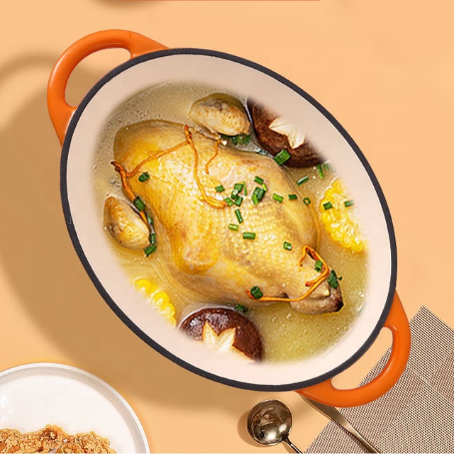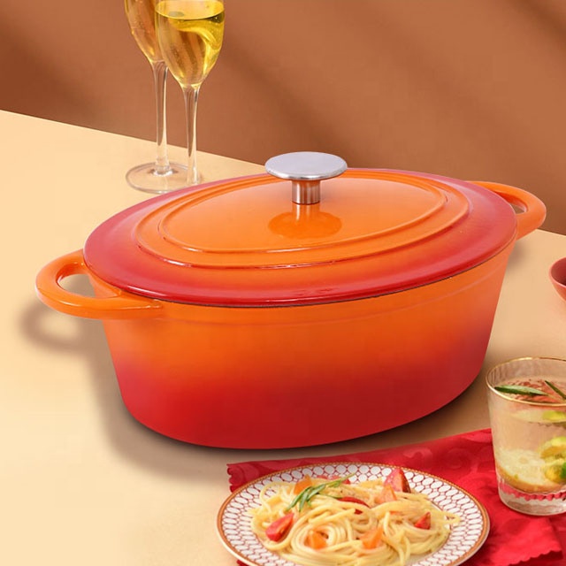 Isitifiketi Esishisayo Esiwolintshi Se-LFGB Sokusakaza I-Iron Enamel Oval Casserole/Oval Cast Ibhodwe Lensimbi Yebhodwe MOQ 500 amapcs ngosayizi nombala ngamunye.